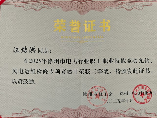 近日,由徐州市總工會和徐州市電力行業(yè)協(xié)會主辦、華潤電力徐州公司承辦的2025年徐州市電力行業(yè)職工職業(yè)技能競賽光伏、風(fēng)電運維檢修專項競賽圓滿落幕,國爍公司派員參加并喜獲三等獎。